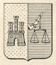 ARMA: Partito: nel 1° d’oro al castello di rosso torricellato di 3 pezzi, merlati alla guelfa, aperto e fincstrato del campo; nel 2° d’azzurro al destrocherio al naturale manicato d’argento e di rosso, impugnante una spada d’argento con l’elsa d’oro, e sostenente una bilancia dello stesso.