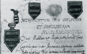 Pagina del codice del "Diario" di C. Castelli, comprovante un atto di pace tra guelfi e ghibellini nel 1398. Il codice, già della famiglia Bonghi, di cui riporta gli stemmi, è conservato presso la Biblioteca Civica di Bergamo