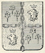 ARMA: Inquartato: al 1° e 4° d’azzurro a tre gigli sbocciati d’ oro, male ordinati: al 2° e 3° d’oro al capo e collo di drago, al naturale, strappato, coronato del campo; colla croce formata da quattro catene legate in cuore ad un anello, d’argento, attraversante sulla partizione.