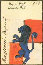 Antica famiglia feudale di Perugia ove tra il XIII e il XVI secolo aveva avuto ruoli eminenti con la presenza via via di valorosi guerrieri, di mecenati,di architetti, ma anche purtroppo di crudeli tiranni la cui sete di potere ne provocò la cacciata. Numerosi risultano a Venezia: così Malatesta Baglioni aveva militato per la Serenissima, così Astorre che difese eroicamente Famagosta (1571); Pentesilea Baglioni era vedova del famoso condottiero Bartolomeo Alviano morto nel 1515. Nella guerra contro gli Austriaci cadde nel 1617 Orazio Baglioni di cui v’è un bellissimo monumento nella Chiesa di San Giovanni e Paolo a Venezia. Questo ramo storicamente importante, si estinse verso la metà del XVII secolo con Malatesta Vescovo di Pesaro e poi di Assisi e Nunzio Apostolico a Vienna. Era il ramo primogenito dei signori di Spello e di Bastia e quello dei signori di Montalera. I Baglioni diedero a Venezia senatori e governatori di varie città: vari importanti funzionari della famiglia Baglioni furono dalla Serenissima inviati a Bergamo, e tra questi sei governatori. Il ramo dei Baglioni tuttora vivente (ora in Lombardia) era pervenuto a Venezia nel XVI sec.: ebbe nel 1684 l’iscrizione al libro d’argento e nel 1717 al patriziato veneto. Conferma della nobiltà veneta con S.A.R. 1818. Questo ramo gestì una celebre casa editrice che sussisteva ancora nel 1824. Essi avevano in Venezia dimora in San Cassian deve avevano acquistato il Palazzo da Mosto. Tra i Baglioni di questo ramo nel XVIII secolo si distinsero Fortunato ed il nipote Gian Tommaso, abati Cassinensi; nel 1785 la N.D. Camilla venne a Bergamo sposa del conte Bonifacio Ottavio Agliardi. Un ramo Baglioni (con stemma diverso) si era trasferito a Bergamo, rappresentato nel 1828 dai fratelli Antonio e Francesco figli di Felice e si è estinto con il nob. Francesco († 1900) studioso d’arte, collezionista e mecenate che fece un cospicuo lascito di preziosi dipinti all’Accademia Carrara. [GPA]