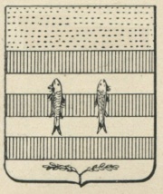 ARMA: Fasciato di rosso e d’argento a due pesci barbi al naturale, addossati; colla fascia d’argento inferiore caricata di un ramo d’olivo, al naturale, movente dalla punta dello scudo e divergente in due ramoscelli: il tutto sotto un capo d’oro.