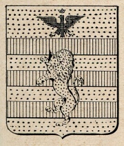 ARMA: Fasciato di rosso e d’oro, al leone del secondo, col capo d’oro, carico di un’aquila di nero, coronata del campo. CIMIERO: Il leone d’oro nascente.
