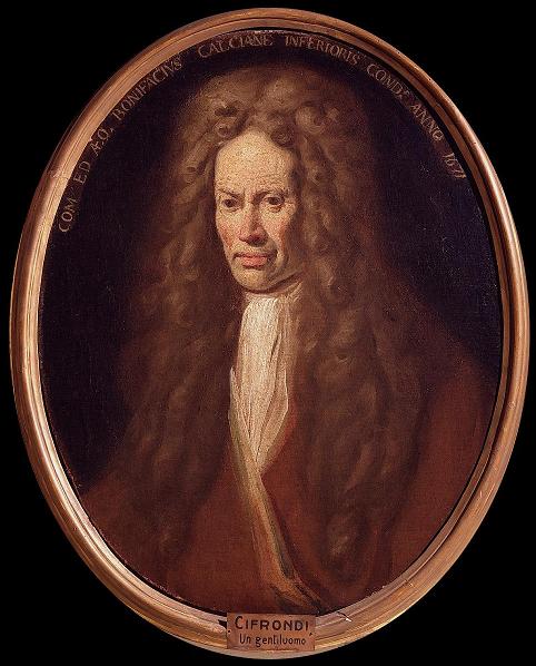 Incorniciato il volto da una parrucca leonina di un tono marrone appena schiarito dalla luce nell’inanellarsi dei capelli, quattro lunghe pennellate di biacca per la sciarpa, un bruno fulvo per distinguere la giacca dal fondo e dalla maestosa “criniera”. Tutto è scabro, ridotto all’essenziale per accentuare la rude severità de volto. Lo sguardo fisso nel vuoto come di chi è preso da chissà quali pensieri, o finge d’esserlo per non guardare negli occhi l’interlocutore; il volto incartapecorito da spigolosi lineamenti e da rughe profonde; qualche pennellata di rosso per ravvivare le gote scarne, il naso poderoso e le labbra carnose. L’estrema povertà della materia pittorica corrisponde all’austera scelta dei colori, quasi che il pittore volesse imporsi la penitenza del monocromo. La tradizione lombarda della realtà è punto di partenza per questo e per quei ritratti di carattere (mendicanti, vecchi, mugnai, cucitrici, ciabattini) ai quali il Cifrondi si dedicò in special modo nell’ultimo periodo della sua vita. Il dipinto, esposto alla mostra fiorentina del “Ritratto italiano dal Caravaggio al Tiepolo” (1911), ha quale pendant il Ritratto del conte, Camillo Agliardi, figlio di Bonifacio. Sul bordo si legge la scritta: “COM. ED. AEQ. BONIFACIUS CALCIANE INFERIORIS CONDS. ANNO 1671”, imprecisa poiché l’Agliardi venne eletto Condomino della Caldana Inferiore nel 1677. La datazione, tenuto conto dello stile e dell’età apparente dell’effigiato, può ritenersi vicina al 1705.