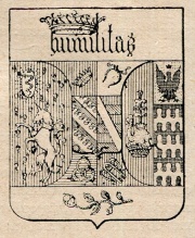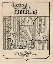 ARMA: Inquartato, con sul tutto, fiancheggiato, serrato con il capo e con la campagna; al primo di rosso, alla corona d’oro, all’antica, posta in sbarra; al secondo di argento a due trecce, al naturale, decussate, legate di rosso, poste in sbarra : al terzo di azzurro a tre anelli d’oro, gemmati di rosso, intrecciati e male ordinati; al quarto di rosso al morso di cavallo all’antica, di argento, posto in banda; al fianco destro di rosso, sparso di fiammelle d’oro, al liocorno d’argento, ritto, accollato di una corona d’oro all’antica, la corona legata, di dietro, con una sciarpa d’argento svolazzante, con un medaglione ovale d’argento, raggiante d’oro, caricato di un biscione di azzurro, ingoiante un puttino di carnagione; il medaglione uscente dall’angolo destro del capo; al fianco sinistro, di rosso al cammello accosciato in una cesta, il tutto d’oro, sostenente con la gobba una corona all’antica, pure d’oro, con un pennacchio di cinque penne di struzzo, alternate di argento e di azzurro uscente dalla corona; il capo di argento carico della parola HUMILITAS in gotico e di nero, sormontata da una corona d’oro, antica, cimata da cinque fioroni, alternati di palle, il tutto d’oro; la campagna di argento carica di un frutto di cedro di oro, gambuto e fogliato di verde, posto in fascia; il sul tutto: partito: a destra: bandato innestato di azzurro, di argento e di verde; a sinistra: fasciato di rosso e di verde, cucito, con la banda di argento.