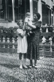 Teresa Bottaini Suardo con in braccio (forse) Gian Maria Suardo e Ninì Scotti nel cortile superiore di palazzo Bottaini a Sovere (1940)