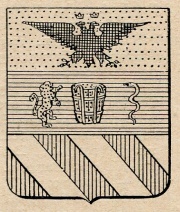 ARMA: Interzato in fascia, al 1° d’oro all’aquila bicipite di nero, coronata del campo sulle due teste; al 2°, d’azzurro ad una brenta d’oro colle due anse di fronte accostata, a destra, da un leoncino rivoltato di oro, a sinistra da un serpe d’argento guizzante in palo: al 3° bandato d’argento.