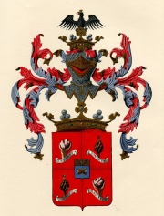 ARMA: Di rosso, inquartato: il 1° e 4° alla mano di carnagione (destra nel 1°, sinistra nel 4°) tenente un sasso al naturale, sostenuta da un breve d’argento svolazzante in sbarra e scritto col motto Also, fest; al 2° e 3°, ai carciofi al naturale fioriti di oro, sostenuti da un breve di argento, svolazzante in banda e scritto col motto: Vor, gott. Sul tutto, di azzurro, a due branche di leone, d’oro, recise in croce di S. Andrea, col capo dell’Impero. (Alias): d’azzurro alle due branche di leone d’oro, recise in croce di S. Andrea, col capo dell’Impero.