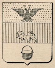 ARMA: Interzato in fascia: nel 1° d’oro all’aquila bicipite di nero, ciascuna testa coronata del campo; nel 2° di rosso al leone leopardito di oro; nel 3° d’argento alla caldaia di nero ripiena del campo.