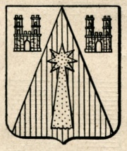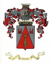 ARMA: D’argento alla cappa di rosso, caricata di una cometa d’oro posta in palo, accostata nei cantoni destro e sinistro del capo da due castelli di rosso, ognuno di due torri dello stesso, aperti e finestrati del campo.