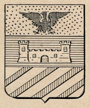 ARMA: Interzato in fascia: nel 1° di oro all’aquila di nero; nel 2° d’azzurro al castello di argento, torricellato di due pezzi dello stesso e aperto del campo; nel 3° d’argento a quattro sbarre di rosso.