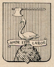 ARMA: Di rosso al cigno d’argento beccato e piotato d’oro, fermo sulla vetta d’un monte erboso al naturale: il cigno sormontato da una scure d’argento, manicata d’oro, coricata in fascia, col motto Amor et labor scritto sopra un breve d’argento, svolazzante in fascia e movente dalla vetta del monte.