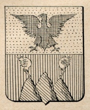 ARMA: Troncato: al 1° d’oro all’aquila di nero; al 2° di rosso a tre monti di verde moventi dalla punta; il 1° e 3° sormontati da due zampe di aquila, affrontate e recise d’argento.