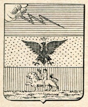 ARMA: Interzato in fascia; al 1° di azzurro al fulmine d’oro uscente in banda da una nuvola, al naturale, movente dall’angolo destro del capo; al 2° di oro all’aquila di nero coronata del campo; al 3° di rosso al puttino a cavallo di un leone illeopardito; il puttino tenente una palma, il tutto sostenuto dalla pianura erbosa ed al naturale. (Diploma 4 febbraio 1827).