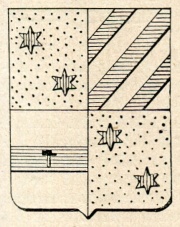 ARMA: Inquartato: al 1° e 4° d’oro a 2 stelle (6) di rosso poste in banda, al 2° d’argento a tre sbarre d’azzurro, al 3° d’argento ad una fascia d’azzurro carica di un martello di ferro manicato di legno.