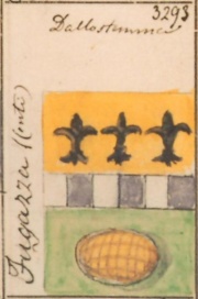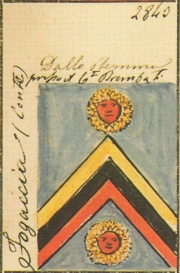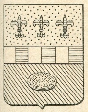 ARMA: Troncato: nel 1° d’oro a tre gigli di azzurro ordinati in fascia; nel 2° di verde alla focaccia di oro; colla fascia scaccata di argento e di azzurro di sei pezzi, attraversante sulla troncatura.