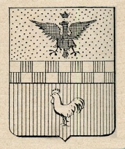 ARMA: Troncato: al 1° d’oro all’aquila coronata, di nero; al 2° di rosso, al gallo d’argento, colla fascia sulla partizione, scaccata di due file d’argento e di rosso.