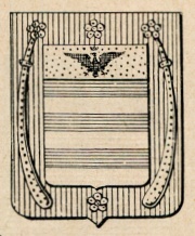 ARMA: Fasciato di azzurro e d’argento, al capo di oro caricato di un’aquila di nero, coronata del campo, il tutto compreso in una bordura di rosso, caricata in capo ed in punta di una rosa d’oro e sui fianchi di due scettri dello stesso, le estremità in capo desinenti ciascuna in una rosa pure dello stesso, e le estremità in punta allargate, ricurve ed affrontate.