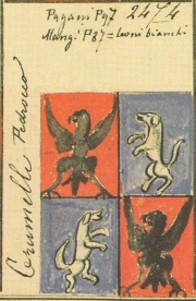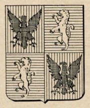 ARMA: Inquartato: nel 1° e 4° di rosso all’aquila di nero; nel 2° e 3° d’azzurro, al leone d’argento linguato e unghiato di rosso.