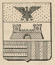 ARMA: Interzato in fascia: 1° d’oro all’aquila di nero; 2° d’argento al castello di verde; 3° partito a destra di rosso a due fascie d’oro, a sinistra palato di rosso e d’oro.
