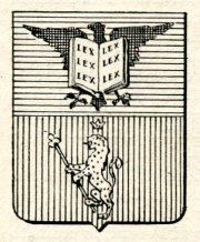 ARMA: Troncato: al 1° d’azzurro all’aquila di nero posta dietro un libro, aperto, portante su ciascuna pagina in lettere romane maiuscole di nero le parola LEX ripetuta verticalmente tre volte su ciascuna pagina, il tutto al naturale; al 2° di rosso al leone d’oro coronato dello stesso e tenente colle branche anteriori e colla branca posteriore destra un bastone al naturale colla cima terminante in trifoglio d’argento posto in banda.