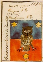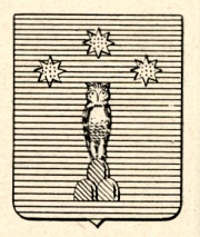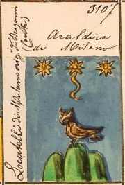 ARMA: Troncato: al 1° d’azzurro a tre stelle (8) d’oro, male ordinate; al 2° d’oro alla, civetta al naturale ferma sulla vetta di un monte di tre cime di verde, uscente dalla punta.