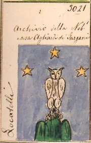 ARMA: Inquartato: al 1° d’argento alla civetta al naturale, coronata e sormontata da tre stelle a sei punte, male ordinate, di oro; ferma sulla cima di un monte di verde, di tre vette; al 2° e 3° sbarrato di nero e di oro di otto pezzi; al 4° di rosso al grifone ritto coronato, tenente una alabarda, il tutto d’oro.
