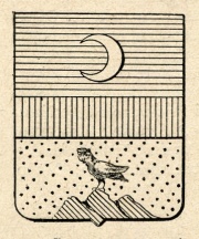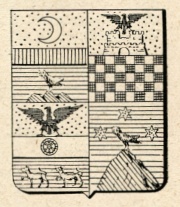 Alias: Troncato: nel 1° d’azzurro al crescente d’argento; nel 2° di oro ad un allocco al naturale posto sulla vetta di un monte di tre cime di verde, movente dalla punta, con la fascia in divisa di rosso sulla troncatura. (R. Arch. Arald. di Milano).