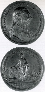 Il 17 gennaio 1785 con l’intervento di Nicolò Venier Capitano di Bergamo nella solita sala dei consigli del Territorio (cioè dell’organismo che riuniva i rappresentanti delle comunità sovracomunali del territorio bergamasco) i difensori delle Valli (Giovanni Pezzoli, Albino Marini, Giovanni Antonio Patirana, Giovanni Antonio Mazzocchi, dottor Carlo Locatelli, Francesco Colla, Carlo Sonzogni, Felice Calvi sostituto), i sindaci generali del Piano (Lodovico Brugnetti, Giovanni Antonio Gambirasio, Giacomo Comotti, Stefano Grena, Domenico Cani, Giacomo Tadini) e deputati di comunità, componenti il Consiglio generale territoriale, decisero di ringraziare il Lupi per il dono dell’ormai celebre “Codex” e di eleggere due deputati che unitamente ai difensori ed al cancelliere notaio Alessandro Bidasio ringraziassero e facessero coniare una medaglia in oro del valore intrinseco di 6 doppie in testimonio del pubblico gradimento ed un’altra d’argento da tenere in Archivio come il “Codex”. Della decisione venne rilasciata copia al Lupi. Per questo incarico fu scelto Don Giovanni Battista Locatelli Zuccala (1754-1825), che redasse anche l’iscrizione onoraria. La medaglia, avente un diametro di circa 42 mm ed uno spessore di 2.5, reca sul recto l’immagine del Lupi di profilo e le parole: MARIO LVPO PRIMICERIO BERGOMATI HISTOR • ET ANTIQVAR •, nonché la firma dell’incisore Antonio Guillemard († 1812) A • GUILLEMARD • F • e sul verso una pianura con sullo sfondo i monti e la Patria che tiene in mano spiegata la carta geografica del territorio bergamasco e sul contorno le parole: BERGOMEI ASSERTIS ANTIQVI FINIBVS AGRI ed ai piedi di un sasso la scritta DEVOTA | VENETIA | CONLOCA|VIT ed infine: CVRATORVM D • S • | MDCCLXXXV in basso. Di questa medaglia il Lupi fece coniare con lo stesso stampo diversi esemplari in oro, argento e bronzo (il Ronchetti dice parte in argento e parte in metallo), il Lupi ne regalò 64 a vari illustri letterati ed amici, molte furono donate dall’Amministrazione del Territorio e molte furono collocate in vari musei d’Italia. L’11 febbraio 1786 l’abate Serassi scrisse al Lupi dicendo di aver ricevuto questa medaglia, lodò l’iniziativa del Territorio, e disse di averne data una al cardinal Carrara ed una al cardinal Giuseppe Garampi (-1792), una di bronzo a monsignor Borgia. Il 18 febbraio scrisse che il martedì precedente il cardinal Carrara avesse mostrato la medaglia al pontefice. Sempre il Serassi in una lettera del 22 aprile 1786 parla della medaglia data al cardinal Giovanni Maria Riminaldi (-1789) che l’avrebbe posta nel museo dell’Università di Ferrara. Anche il bergamasco Antonio Alberici, grande amico del Lupi, prosegretario della Sacra Congregazione del Concilio gli scrisse, lodando la medaglia e dicendo che era stata lodata da tutti gli intenditori in Roma. Don Alessandro Barca da Padova il 22 febbraio 1786 ringraziò della medaglia per l’Accademia di quella città.