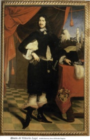 Olio su tela, cm 218x141. Bergamo, Collezione privata della nobile Daina de Valsecchi. Il conte è ritratto a figura intera con spada e speroni, appoggiato ad un tavolo sulla tovaglia del quale si trova lo stemma e sulla quale è appoggiato un cappello piumato tipico dell’epoca. Al di sotto vi è la scritta: VICTORIVS LVPVS 1650 Lo sfondo di una tenda aperta a rivelare una villa patrizia con statue e giardino all’italiana. In precedenza era attribuito a Carlo Ceresa, ora a scuola francese, forse di Nicolas Regnier.