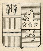 ARMA: Partito, nel 1° di rosso alla fascia d’argento caricata di una trangla di nero, col capo d’argento ai due angeli sostenenti una croce di nero, sostenuto da una fascia d’argento; nel 2° d’azzurro al cavallo rampante d’argento attraversato da una fascia dello stesso caricata da tre stelle d’oro.