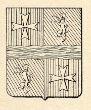 ARMA: Inquartato: al 1° e 4° di rosso alla croce d’argento di 8 punte; al 2° e 3° di verde, al cane di argento collarinato di rosso; col fiume al naturale scorrente in fascia sopra la troncatura (Cod. Araldico, f. 155).