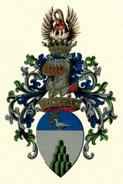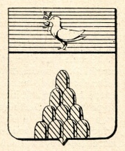 Alias: Semipartito troncato: nel 1° d’azzurro ad un ristretto di terreno al naturale sostenente una colomba d’argento, tenente nel becco un ramoscello d’olivo di verde; nel 2° di rosso al muro di fortezza mattonato d’argento e merlato alla guelfa; nel 3° d’argento a 10 monti di verde moventi dalla punta (Arma baronale napoleonica).