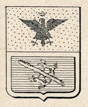 ARMA: Troncato, al 1° d’oro all’aquila di nero coronata del campo; al 2° d’azzurro al bastone nodoso, reciso, posto in banda al naturale, sostenente 2 volpi di argento, contropassanti, nello stesso verso, a destra; questo punto colla spezzatura di una bordatura d’argento.