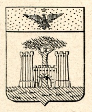 ARMA D’argento all’olivo nodrito nella pianura erbosa, al naturale, col castello di rosso, fondato nella pianura ed attraversante sull’olivo; col capo d’oro, carico di un’aquila di nero, coronata d’oro.
