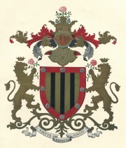 SOSTEGNI: Due leoni, coronati, d’oro, affrontati e tenenti ciascuno rispettivamente con la branca sinistra e destra un ramo di rosaio. Per gli altri discendenti maschi lo scudo è sormontato da elmo e corona da nobile o da patrizio con cercine, svolazzi e cimiero e sostegni come sopra, e per le femmine, omessi tutti gli altri ornamenti, è sormontato dalla sola corona da nobile e posta fra due rami di palma al naturale, divergenti e decussati sotto la punta dello scudo. (D. M. 16 maggio 1895).