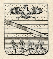 Alias: Interzato in fascia: nel 1° d’oro all’aquila di nero coronata del campo; nel 2° fasciato d’argento e d’oro di quattro pezzi, con la banda di rosso attraversante; nel 3° campo di cielo a quattro piante moventi da una palude nascente dalla punta, poste in fascia, il tutto al naturale (Codice Araldico, Archivio Stato Milano, pag. 126).