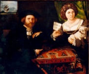 More recently, Amaglio (1992) has proposed an identification of the couple as Antonio Agliardi — a prominent man of wealth in Bergamo and an acquaintance of Lotto — and his wife Apollonia Cassotti; this idea is based on the fact that the woman is wearing a headdress (capigliara) identical to the one worn by Agnese Avinatri, wife of Paolo Cassotti, in Previtali’s Sacra Conversazione (Accademia Carrara, Bergamo). In essence, two women belonging to two different branches of the Cassotti family would have received as a wedding gift from their respective father and husband identical capigliare.