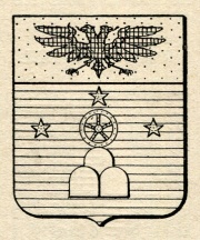 ARMA: D’azzurro al monte di tre cime d’argento, ristretto, sormontato da una ruota di cinque raggi, e questa da tre stelle di sei raggi male ordinate, il tutto di oro; col capo dello stesso carico di un’aquila bicipite di nero.
