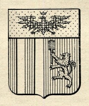 ARMA: Partito: nel 1° palato di rosso e d’argento di quattro pezzi; nel 2° di rosso al leone d’oro tenente nella zampa anteriore uno scovolo (scopino di setole) dello stesso; il tutto col capo di oro carico di un’aquila di nero, coronata del campo.