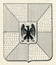ARMA: grembiato di rosso e d’argento di otto pezzi, al bisante d’oro, posto in cuore, carico di un’aquila di nero, coronata del campo e linguata di rosso.