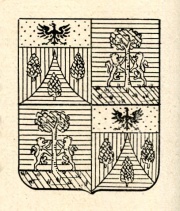 ARMA: Inquartato: nel 1° e 4° d’azzurro, mantellato di rosso, ciascun punto caricato di una pigna d’argento; col capo d’oro carico di un’aquila di aero; nel 2° e 3° d’azzurro all’albero nodrito nella pianura erbosa e sostenuto da due leoncini, affrontati, il tutto al naturale.
