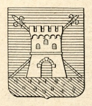 ARMA: D’azzurro a due aste cimate da un fiordaliso d’oro poste in croce di Sant’Andrea ed al mastio d’argento merlato di cinque pezzi alla guelfa, aperto del campo e sorgente dalla campagna erbosa di verde attraversante sul tutto. (Stemma presentato per il ricon. dalla nobiltà da Filippo qm. Scipione il 14 maggio 1819).