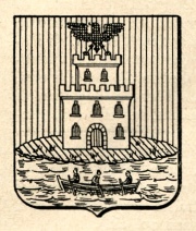 ARMA: Troncato: nel 1° di rosso al mastio di fortezza d’argento di due piani, merlato alla ghibellina, fondato nella pianura erbosa al naturale, sostenente un’aquila di nero; nel 2° mareggiato con una barca vogante con tre rematori, il tutto al naturale.