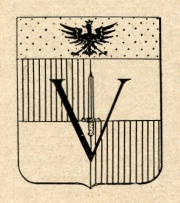 ARMA: Troncato: nel 1° d’oro all’aquila di nero coronata del campo; nel 2° inquartato di rosso e d’argento alla lettera V maiuscola romana di nero, attraversante sulla inquartatura (Codice Aral. Lombardo, pag. 91).